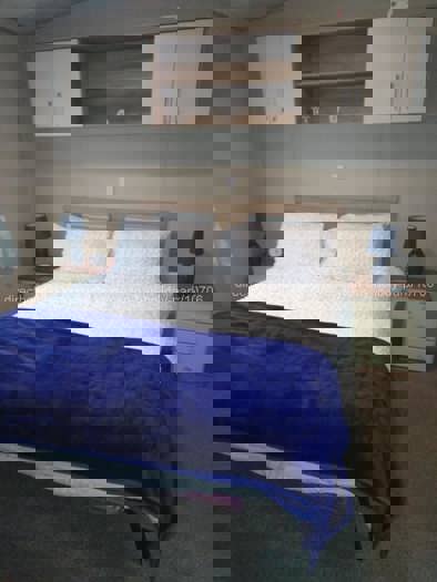 Our lovely central heated and double glazed caravan for hire on Cayton Bay Holiday Park, has two bedrooms. The master bedroom has a king size bed, double wardrobe, two small lamps and a Smart TV, along with an en-suite toilet with hand basin. The second bedroom has twin single beds, a wardrobe and TV. There is also a pull-out double bed in the lounge.