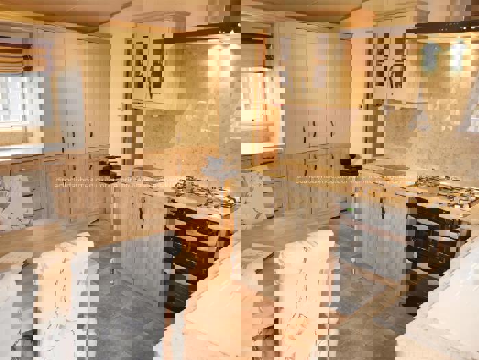 The kitchen has ample cupboard space and is fully equipped with all that you require in terms of crockery, pots, pans etc. Appliances include a 5-burner hob, oven and grill, along with a built-in microwave, integrated fridge freezer, dishwasher and washing machine.
