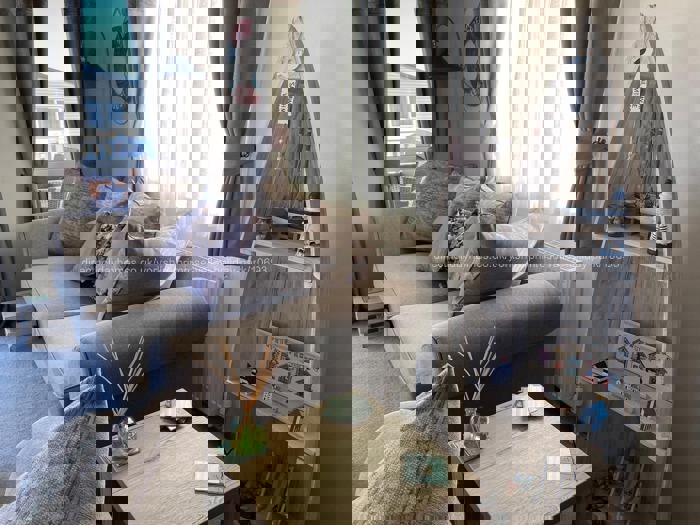 The second bedroom has two 3' single beds with storage underneath, along with a wardrobe, stylish dressing table, TV and views of the sea.