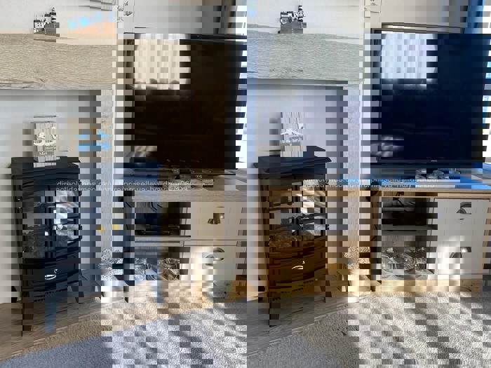 Double patio doors lead from the decking into a spacious open plan lounge/diner, where you will find two freestanding sofas, enabling you to sit in comfort and take in those stunning sea views. One of the sofas converts easily into a comfortable double bed. There's a 43" Smart TV, DVD player, a quality sound bar and Wi-Fi. In addition, you will find a built-in Bluetooth sound system to play your favourite tunes!