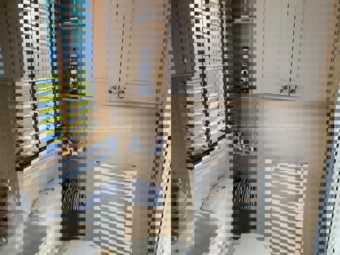 The doorway leads to a large entrance hall, with a tall cupboard housing the combi boiler and alarm, along with a hoover.