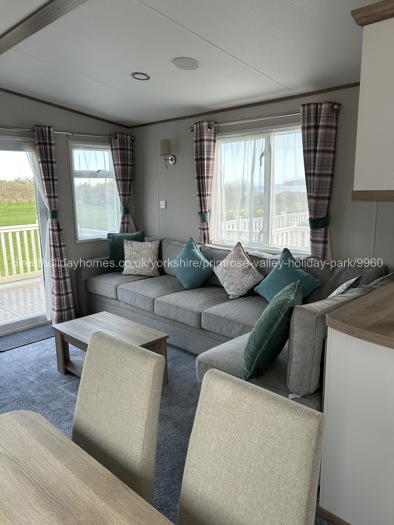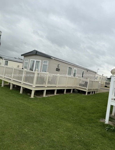 Family-owned caravan with decking for hire on Primrose Valley Holiday Park in Filey, boasting a front row position on Pine Ridge, with lovely sea views and overlooking a green area.